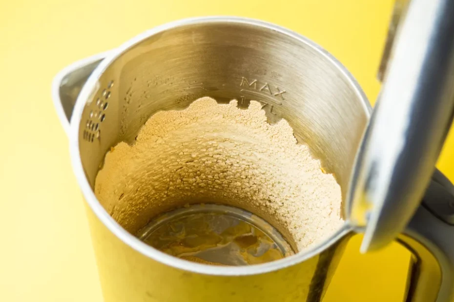 Geben Sie 1 Esslöffel Backpulver hinzu und kochen Sie das Wasser im Wasserkocher mit Backpulver auf – Backpulver weicht den Kalk auf, sodass er sich leicht entfernen lässt.